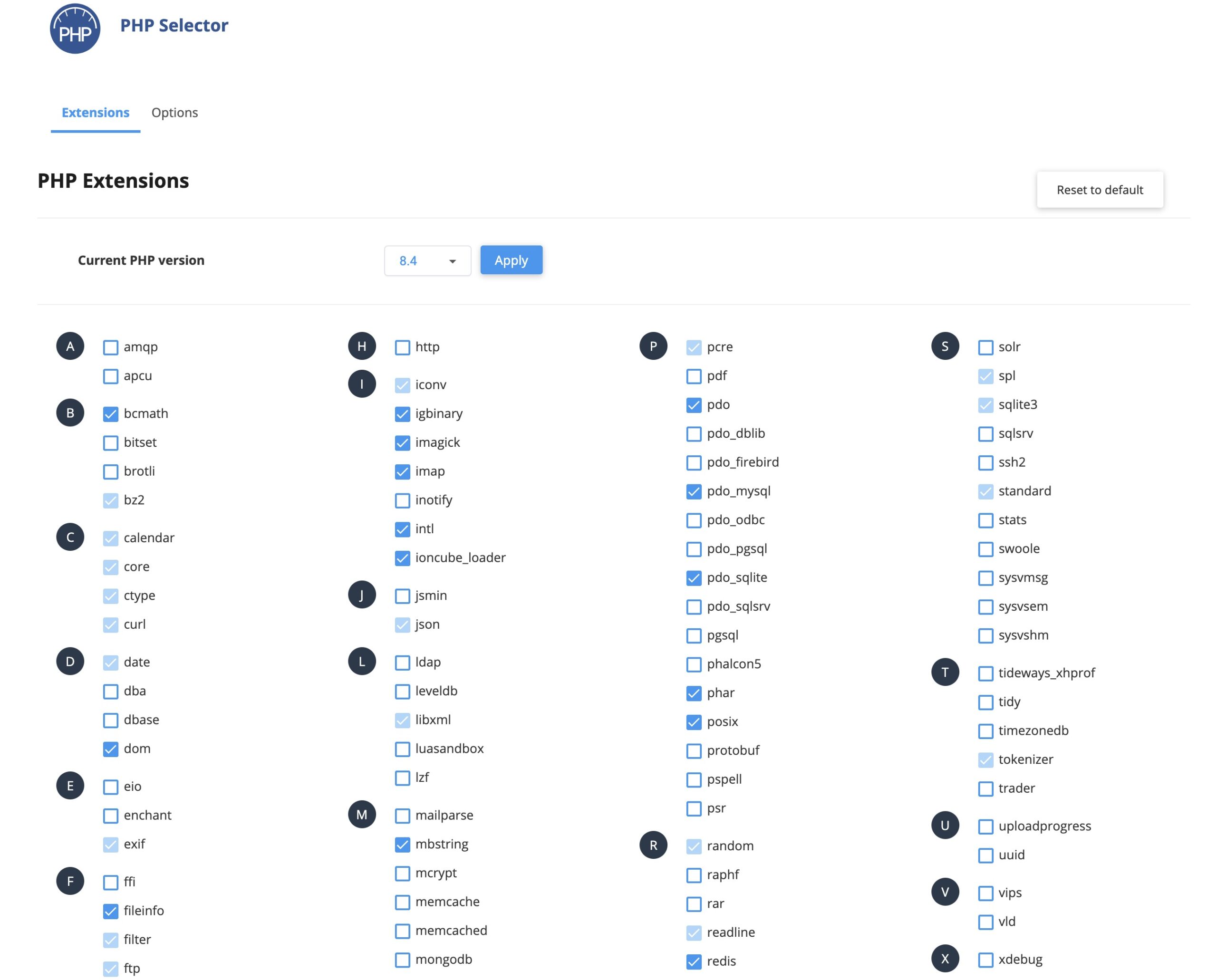 < All Topics Main Running Scripts Change PHP Version Print Change PHP VersionWithout CloudLinux: 1. Log in to your DirectAdmin account. 2. Select Icon Php Settings: 3. Choose the desired PHP version from the dropdown menu 4. Click the Update Version button to apply the changes. 5. The change may take 1 or 2 minutes With CloudLinux: 1. Log in to your DirectAdmin account. 2. Select Icon Select PHP Version 3. Choose the desired PHP version and check PHP extensions. Screenshot 4. Click the Apply button to apply the changes.